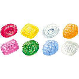 イチゴ、ハッカ、リンゴ、スモモ、レモン、メロン、オレンジ、パイン、8つの味に5種類の形。