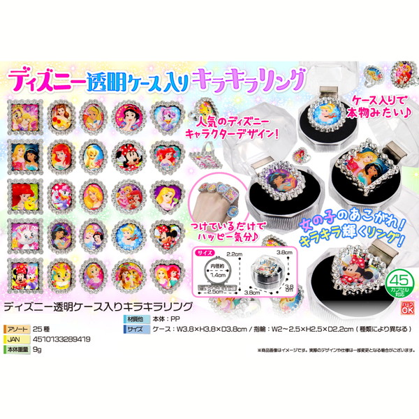 つけているだけでハッピー気分♪ケース入りで本物みたい♪ディズニー透明ケース入りキラキラリングです。 サイズ(約):ケースH3.8cm×W3.8cm×D3.8cm 25種アソート