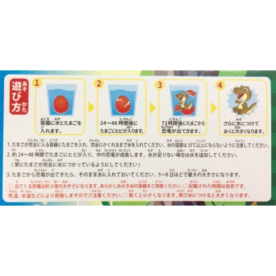 水につけて約24~48時間でたまごにヒビが入り、中の恐竜が成長します。